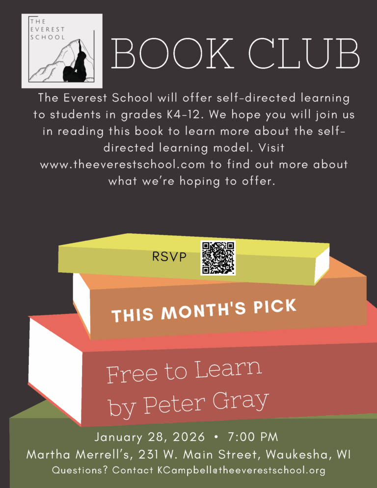 We hope you will join us in reading this book, Free To Learn by author Peter Gray to learn more about the self-directed learning model.