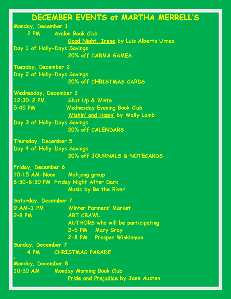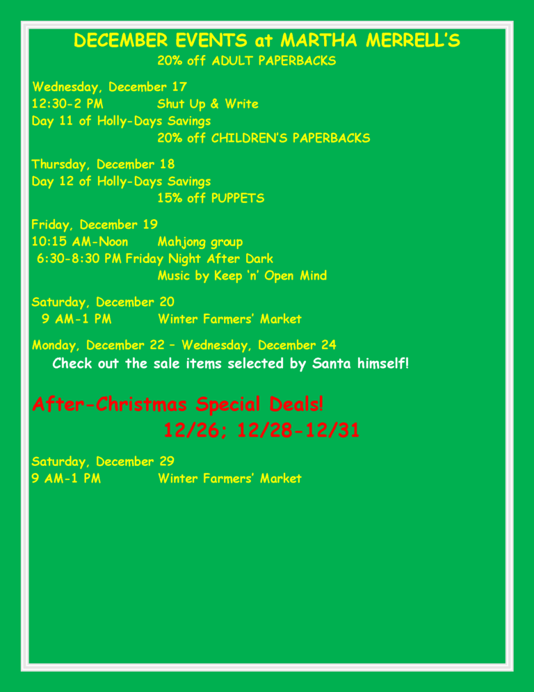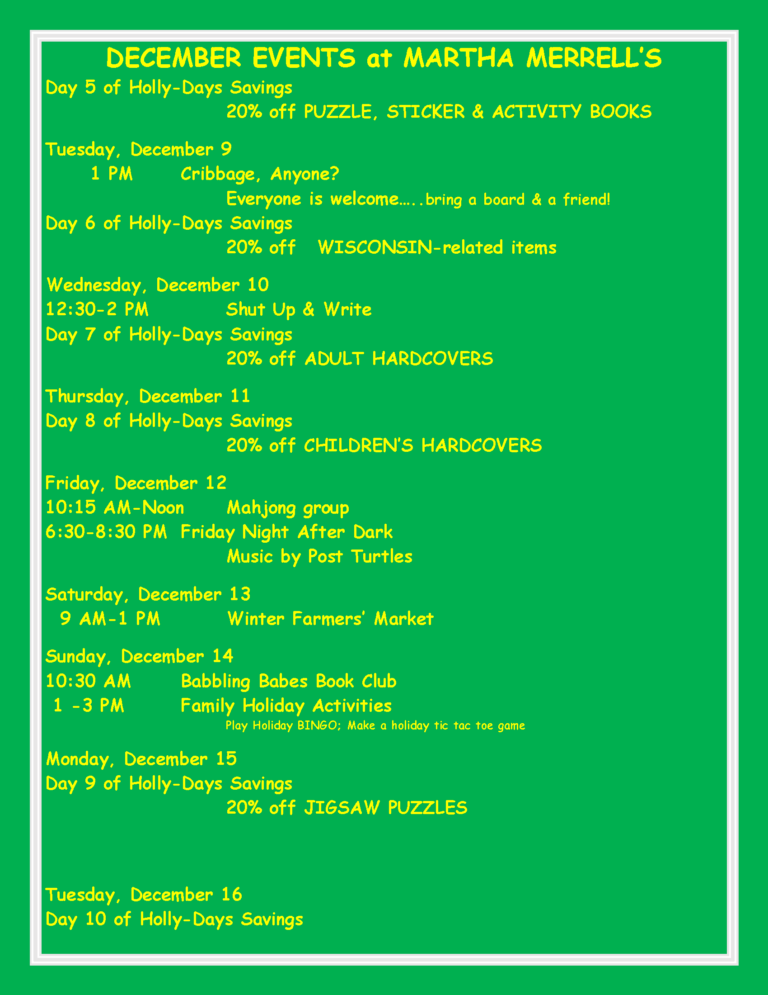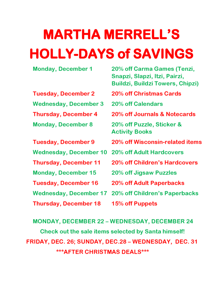 Home Page Martha Merrell’s Books, Toys & Gifts is now listed on TravelWisconsin.com as a great place to shop! view our listing here: https://www.travelwisconsin.com/shopping/martha-merrells-books,-toys-gifts-279112. WHAT’S GOING ON THIS MONTH! LIVE MUSIC FRIDAY NIGHT AFTER DARK at Martha Merrell’s!